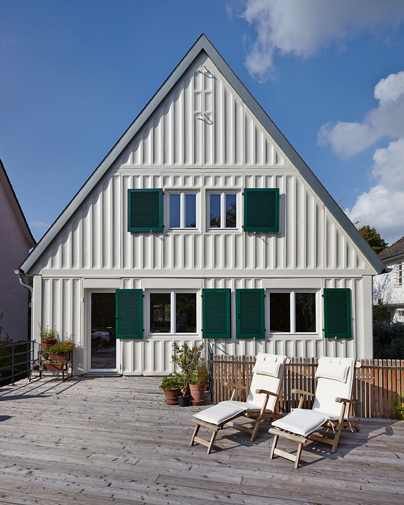 Da die Nutzflächen im denkmalgeschützten Stahlhaus nicht ausreichten, um das Architekturbüro im Gebäude unterzubringen, wurde das Haus zur abfallenden Gartenseite hin durch einen leicht ins Gelände eingegrabenen Baukörper erweitert, der durch einen separaten Eingangshof erschlossen wird.